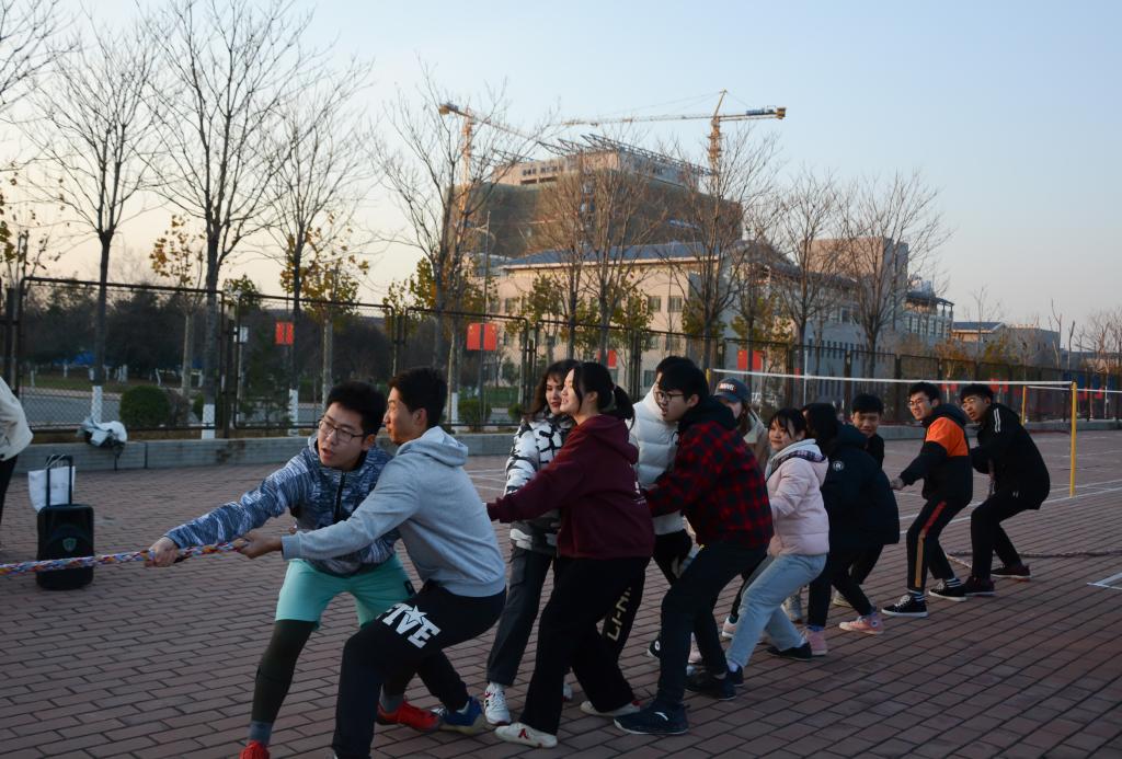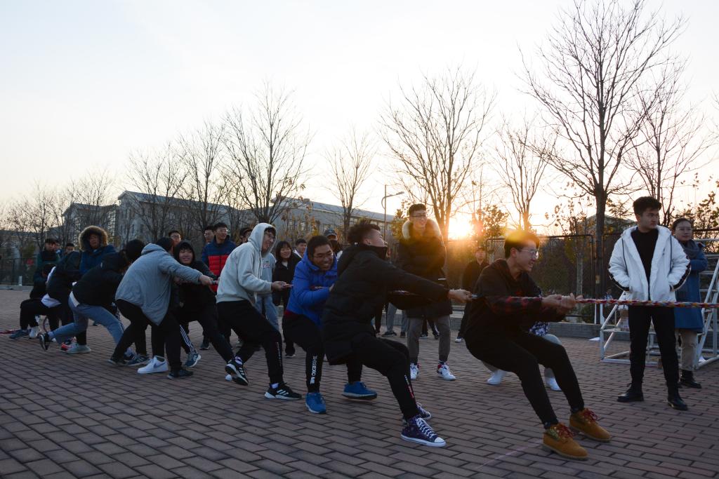 一,二,拉!所有同学压低重心,身体后仰,用尽力量拉拽绳子,一根麻绳,连接的是两个班级众志成城的热血,见证的是两个班级毫不退让的激情。