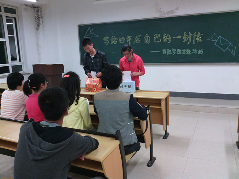 组织2013级新生开展了主题为“写给四年后自己的一封信”书信活动。目的是督促新生确定目标和梦想,合理规划大学四年,然后由学院辅导员老师为同学们妥善保管信件。