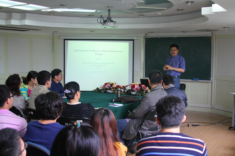 蔡军做了题为《最优再保险设计中的优化问题》的学术报告。他介绍了他们所提出的新的优化准则—最大化两公司的联合生存概率、联合获利概率;作为应用,研究了期望保费原则、方差保费原则、一般再保险保费原则下停止损失再保险、成数再保险、有限停止损失再保险的最优策略。并且介绍了他们在联合VaR准则下的最优再保险最新进展。最后提出了一些值得进一步深入研究的开放性问题。