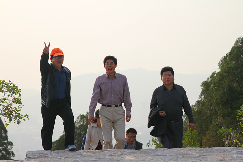 不到半个小时,大家便陆续登上山顶。山巅有古香古色的展秋亭,古朴的建筑在青山映衬下别有一番景致。大家站在山顶,体验着“会当凌绝顶,一览众山小”的恢宏气魄。眺望远方,青山蜿蜒,伴随着习习清风,顿觉心旷神怡。