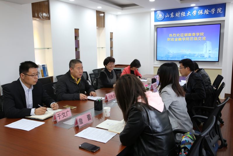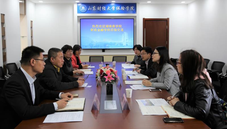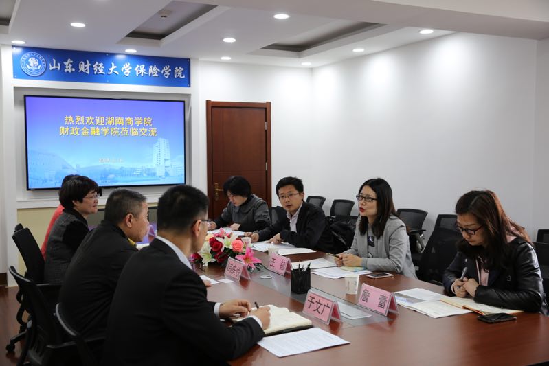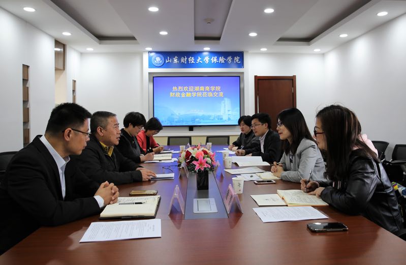4月16日上午,湖南商学院财政金融学院副院长王韧教授、保险学系副主任胡锡亮老师以及袁艳霞老师、詹蕾老师一行四人到禁漫 调研座谈。禁漫 院长闫庆悦教授,副院长刘素春教授、副院长于文广教授、风险管理与保险系副主任付红副教授参加了此次座谈活动。闫庆悦院长对湖南商学院财政金融学院一行的来访表示热烈欢迎,并介绍了禁漫 概况。双方就保险学专业培养方案、保险学科建设、课程设置、实验教学、大类招生、毕业生就业情况等问题进行了交流。