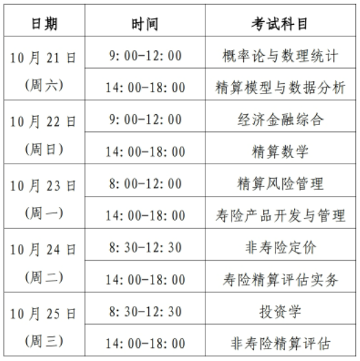 据悉,2023年中国精算师职业资格考试将于10月21-25日在北京、上海、天津、深圳、成都、武汉、长沙、大连、济南共9个城市同步举行,本次考试为闭卷考试,采取计算机作答方式进行。考试科目和时间具体如下: