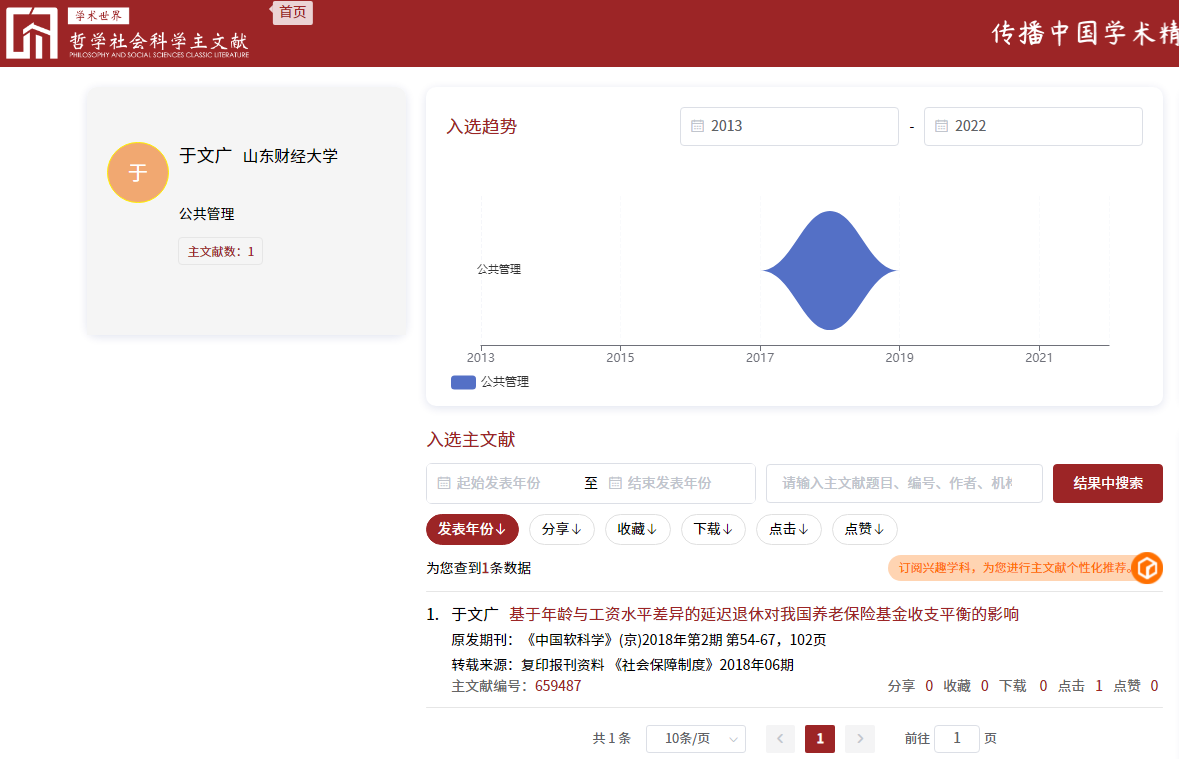 近日,收到中国人民大学书报资料中心通知,由中国人民大学建设的中国哲学社会科学自主知识体系数字创新平台之“主文献体系”平台发布了2013-2022入选论文,共有20621篇论文收录为主文献,涉及25个一级学科,107个二级科学,作者15454人,期刊1302种,其中禁漫 27名教师的40篇论文入选主文献,涉及理论经济学、应用经济学、公共管理、工商管理、教育学、农村经济管理6个一级学科。禁漫 于文广教授榜上有名,其2018年在《中国软科学》上发表的封面论文《基于年龄与工资水平差异的延迟退休对我国养老保险基金收支平衡的影响》成功入选,成为公共管理学科520篇主文献之一。