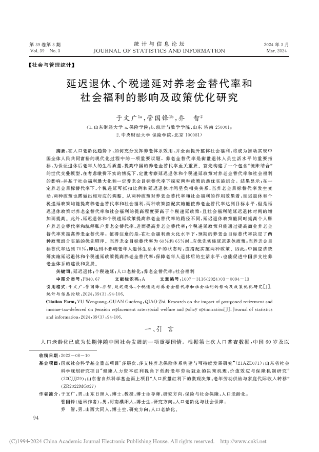 Citation Form:YU Wenguang, GUAN Guofeng, QIAO Zhi. Research on the impact of postponed retirement and income-tax-deferred on pension replacement rate, social welfare and policy optimization[J]. Journal of Statistics and Information, 2024, 39(3): 94-106.