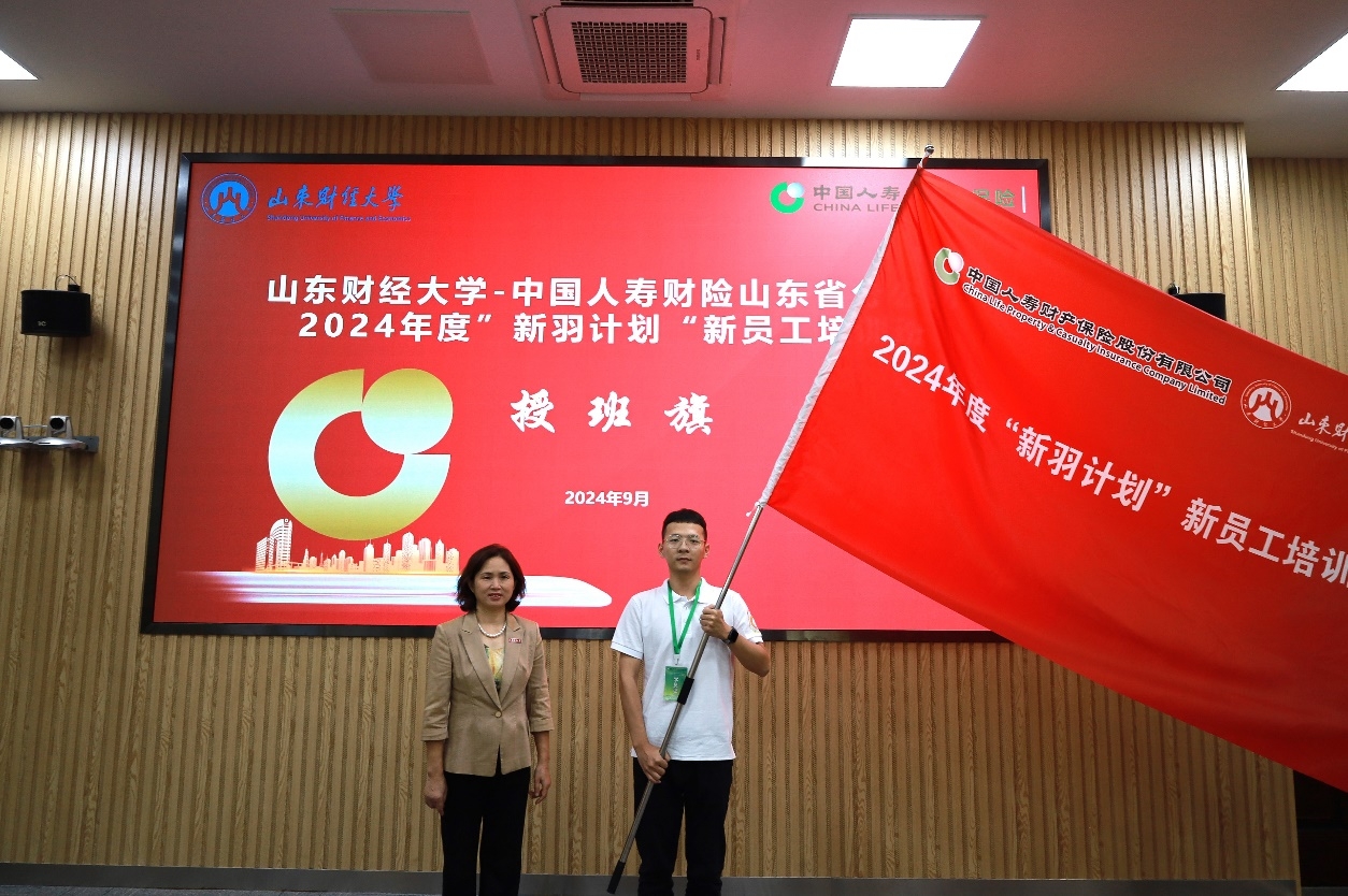 禁漫 党委书记张娟向培训班学员代表授予禁漫 -中国人寿财险山东省分公司2024年度“新羽计划”新员工培训班班旗。