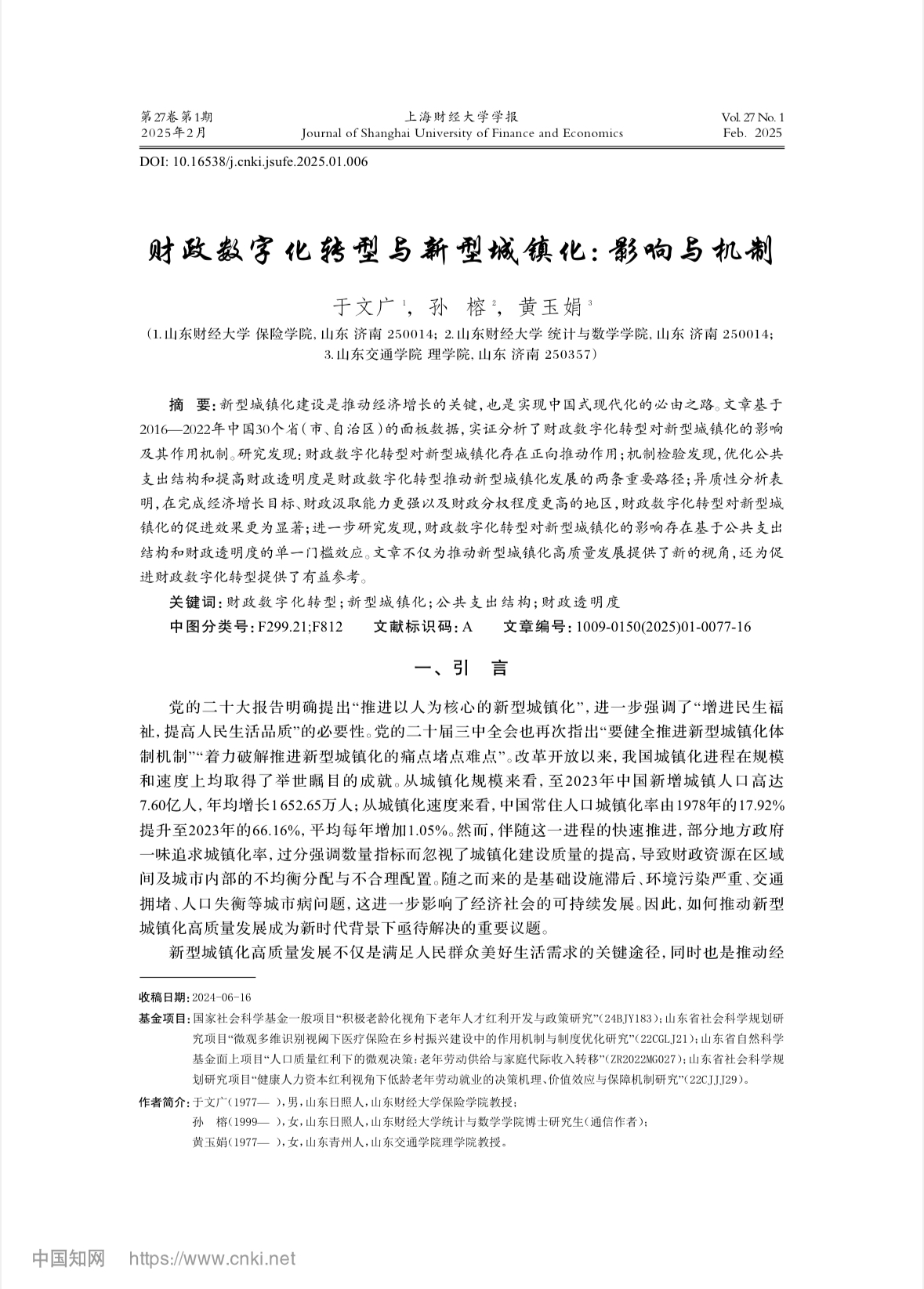 禁漫 于文广教授作为第一作者与合作者撰写的论文“财政数字化转型与新型城镇化:影响与机制”在期刊《上海财经大学学报》2025年第1期上发表封面论文。该期刊系我校新版期刊目录A2类期刊。新型城镇化建设是推动经济增长的关键,也是实现中国式现代化的必由之路。文章基于2016—2022年中国30个省(自治区、直辖市)的面板数据,实证分析了财政数字化转型对新型城镇化的影响及其作用机制。研究发现:财政数字化转型对新型城镇化存在正向推动作用;机制检验发现,优化公共支出结构和提高财政透明度是财政数字化转型推动新型城镇化发展的两条重要路径;异质性分析表明,在完成经济增长目标、财政汲取能力更强以及财政分权程度更高的地区,财政数字化转型对新型城镇化的促进效果更为显著;进一步研究发现,财政数字化转型对新型城镇化的影响存在基于公共支出结构和财政透明度的单一门槛效应。文章不仅为推动新型城镇化高质量发展提供了新的视角,还为促进财政数字化转型提供了有益参考。
