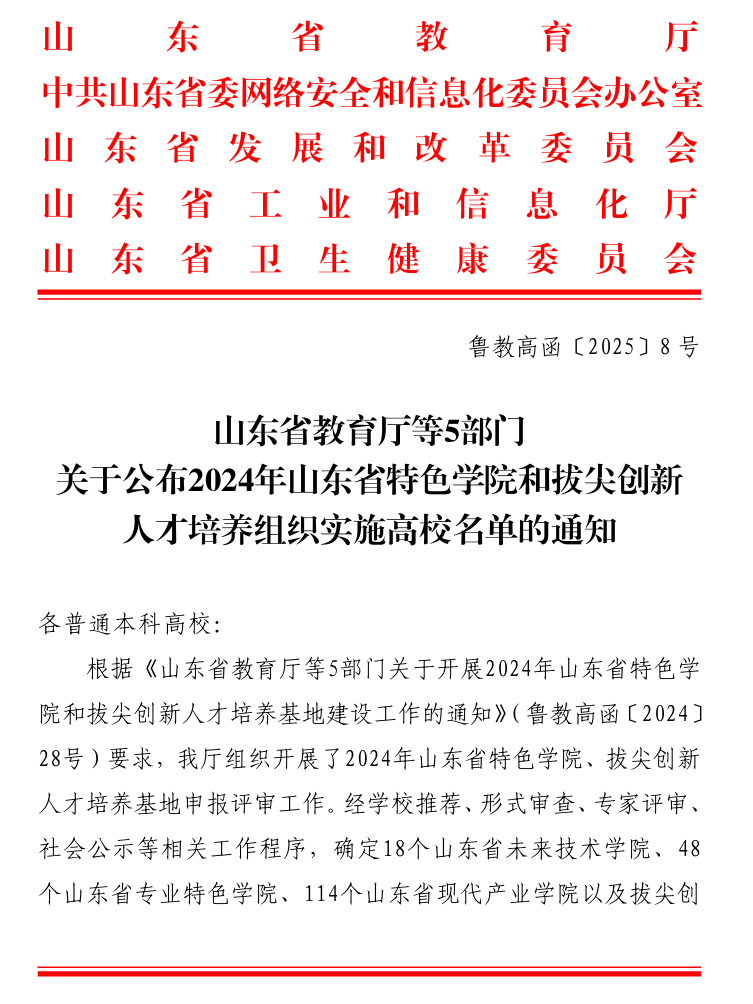 近日,山东省教育厅等五部门印发《关于公布2024年山东省特色学院和拔尖创新人才培养组织实施高校名单的通知》,禁漫 申报的医养健康精算大数据产业学院获批。