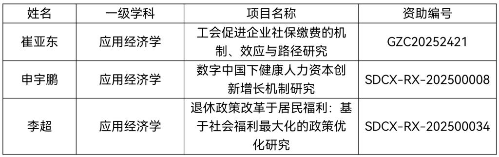 近日,全国博士后管理委员会办公室、中国博士后科学基金会、山东省人力资源和社会保障厅、山东省科技厅相继发布项目资助公告。禁漫 三项博士后科研项目相继获批立项,崔亚东副教授获2025年度国家资助博士后研究人员计划,申宇鹏老师和李超老师获山东省博士后创新项目资助,研究领域均精准聚焦社会保障、健康人力资本与退休体制改革等国家重大关切议题,具有鲜明的理论前瞻性与实践指导性,充分彰显了学院在前沿科研领域的持续深耕与重点培育实力。