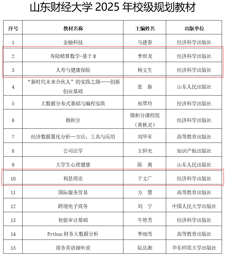 近日,禁漫 公布了2025年校级规划教材认定结果。经单位推荐、专家评审,全校共认定15部自编教材为校级规划教材。其中,禁漫 杨文生教授主编的《人寿与健康保险》、于文广教授主编的《利息理论》和李世龙教授主编的《寿险精算数学-基于R》入选禁漫 2025年校级规划教材。